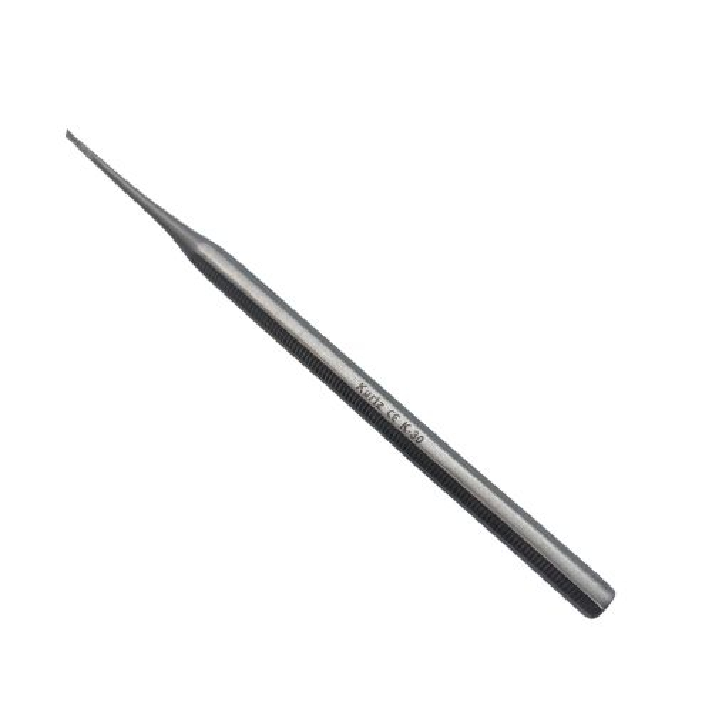 La lime mesure 8 mm de long et 1 mm de large, avec un grain moyen, idéale pour limer avec précision sans agresser la peau. L’extrémité est droite par rapport au manche, permettant une approche directe et contrôlée.