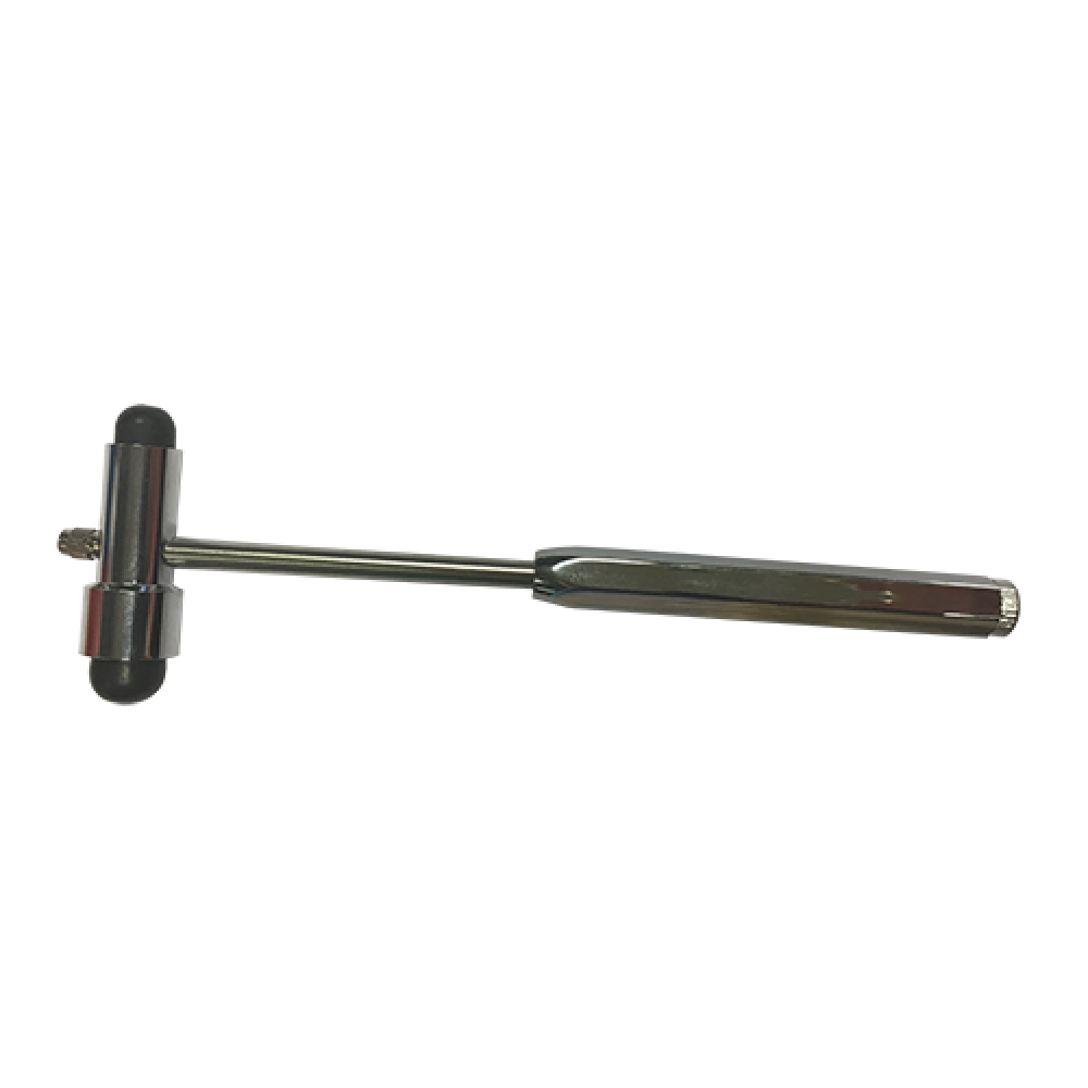 Marteau à réflexes professionnel en acier inoxydable avec deux embouts en caoutchouc. Conçu pour des examens neurologiques rapides et confortables au cabinet de pédicurie-podologie.