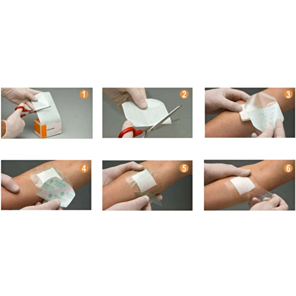 Reinig en droog de huid. Knip de folie op maat (hoeken afronden), verwijder de drager en breng zonder spanning aan. Wrijf licht aan voor optimale hechting. Vervang volgens professionele richtlijn of wanneer nodig.