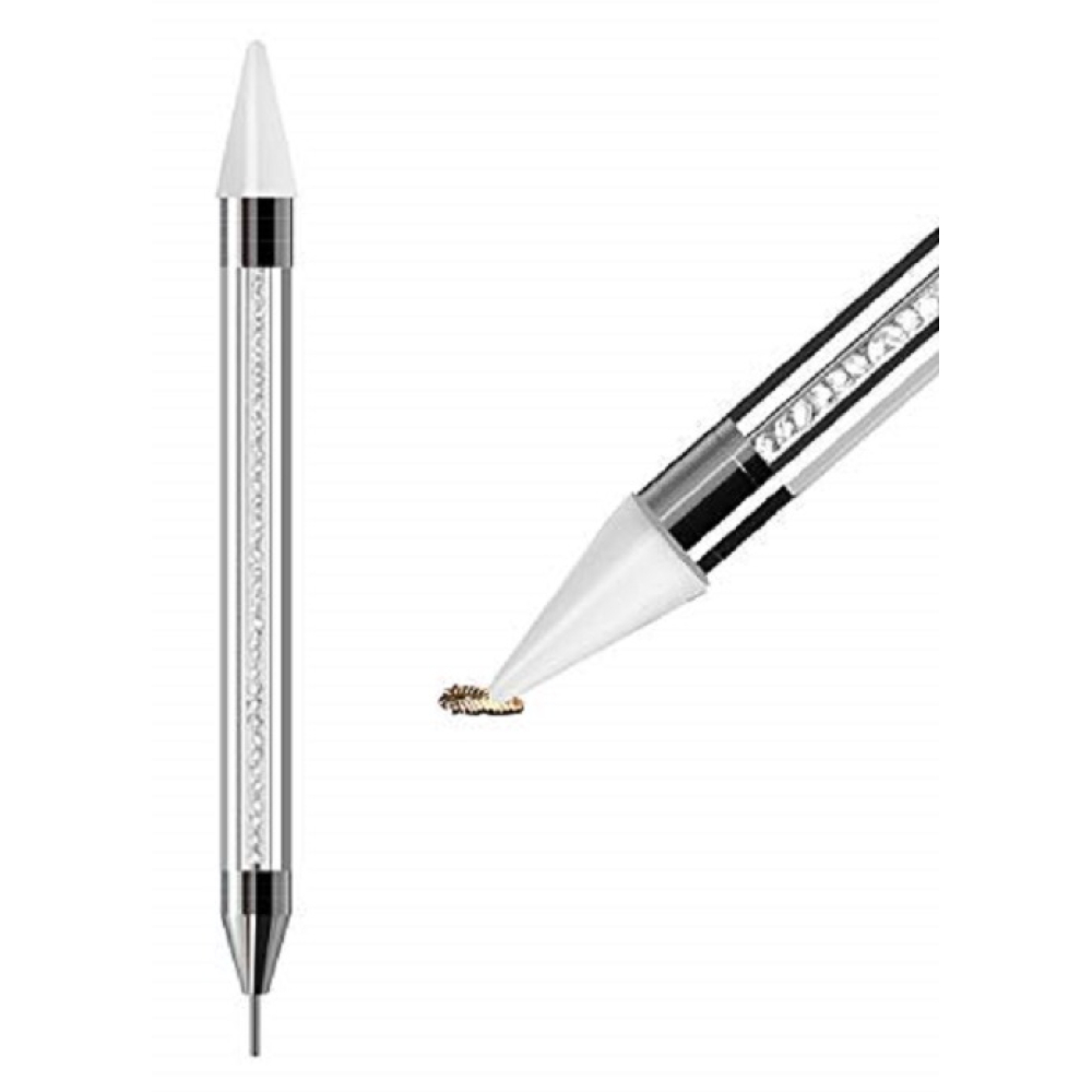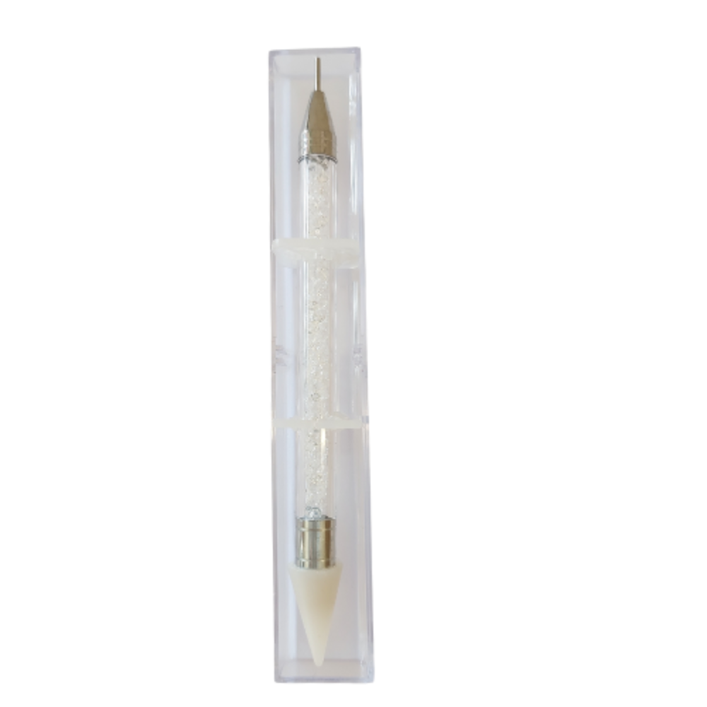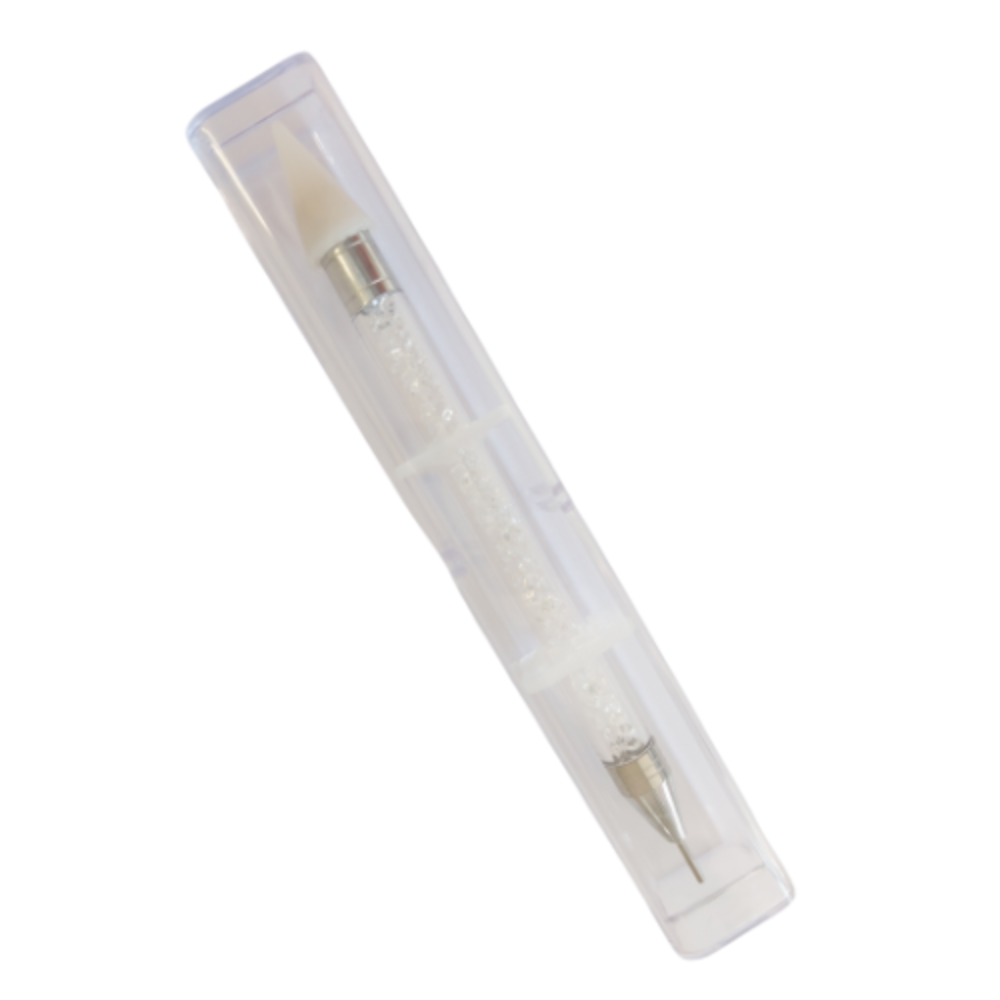 De ene zijde van de tool heeft een fijne punt, ideaal voor het precies plaatsen van kristallen en steentjes. De andere zijde is afgewerkt met een platte kop, waarmee je zachte druk uitoefent zodat de decoraties stevig blijven zitten.