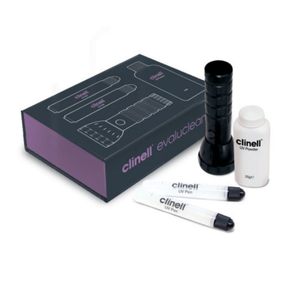 De Clinell UV-kit is een professioneel testmiddel om te controleren of jouw ontsmettings- en reinigingsprocessen effectief verlopen. Met behulp van fluorescerende gel of poeder breng je onzichtbare markeringen aan op oppervlakken, die onder een UV-lamp zichtbaar worden. Zo zie je in één oogopslag of het reinigingsprotocol correct werd uitgevoerd.